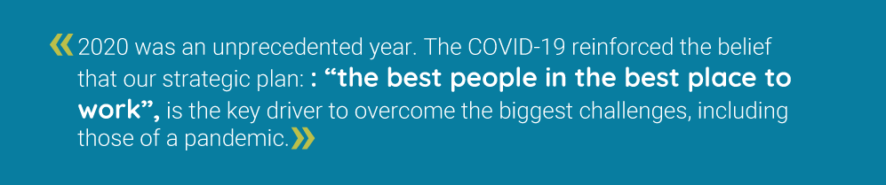 We are proud to have the human talent that has led the company to think and act differently, with high-performance standards, great commitment, and great resourcefulness, focused on creating value for our stakeholders. In 2021 we will continue to have the best people and will continue to be the best place to work