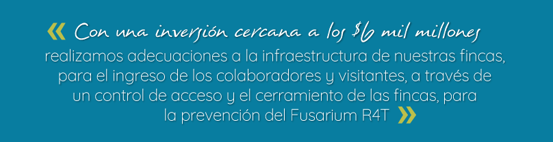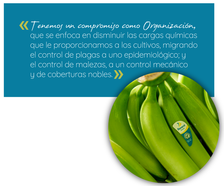Dentro de los controles que realizamos periódicamente en nuestros cultivos, para garantizar una estabilidad y supervivencia, establecemos controles de malezas, controles integrales de plagas y enfermedades, con énfasis en la Sigatoka Negra, para el caso de nuestros cultivos de banano. Nuestro reto está enfocado en disminuir la carga química y migrar a controladores orgánicos.