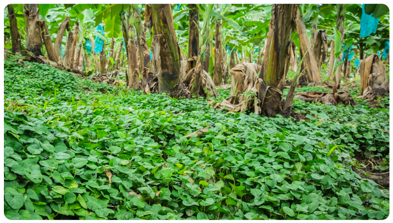 (CV-1) Para el manejo y conservación de los suelos, hemos establecido la siembra de coberturas naturales en los cultivos, que permiten la retención de la humedad, previenen la presencia de enfermedades que puedan afectar el desarrollo de las plantas y generan un incremento microbiológico, reduciendo la pérdida de suelos por escorrentía y el uso de agroquímicos.