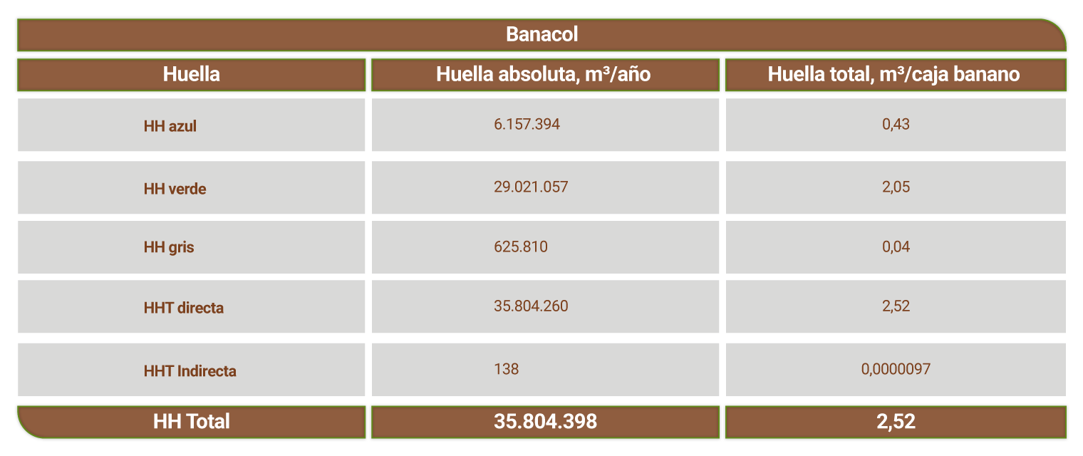 La metodología utilizada para el cálculo de la huella hídrica es la especificada por la norma ISO 140 46. Para su estimación en Banacol, en 2020, calculamos las huellas azul, verde y gris, a partir de los consumos de agua de cada una de las sedes: esto se hizo teniendo en cuenta el origen del recurso: acueducto, captación de agua subterránea, agua lluvia, agua suministrada por carro cisterna y agua recirculada; además de las descargas de aguas residuales generadas.