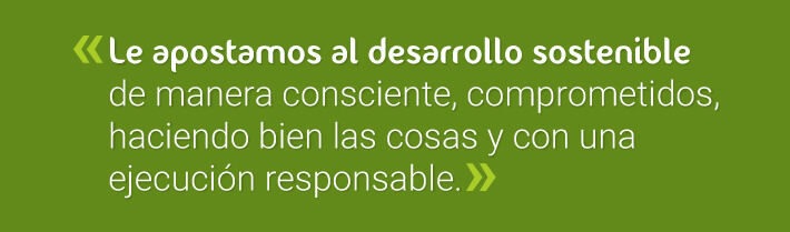 Le apostamos al desarrollo sostenible de manera consciente, comprometidos, haciendo bien las cosas y con una ejecución responsable, para así lograr un desempeño económico que genere un impacto positivo en nuestra gente, las comunidades y los ecosistemas, identificados y alineados con un propósito global, de cara al cuidado del medio ambiente y la gestión social.
