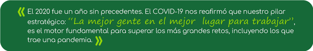 Para nosotros es un orgullo contar con el talento humano que ha llevado a la Compañía a pensar y a actuar diferente, con altos estándares de desempeño, un gran compromiso y mucha recursividad, focalizados en la generación de valor para nuestros grupos de interés. En 2021 seguiremos contando con la mejor gente y seguiremos siendo el mejor lugar para trabajar.